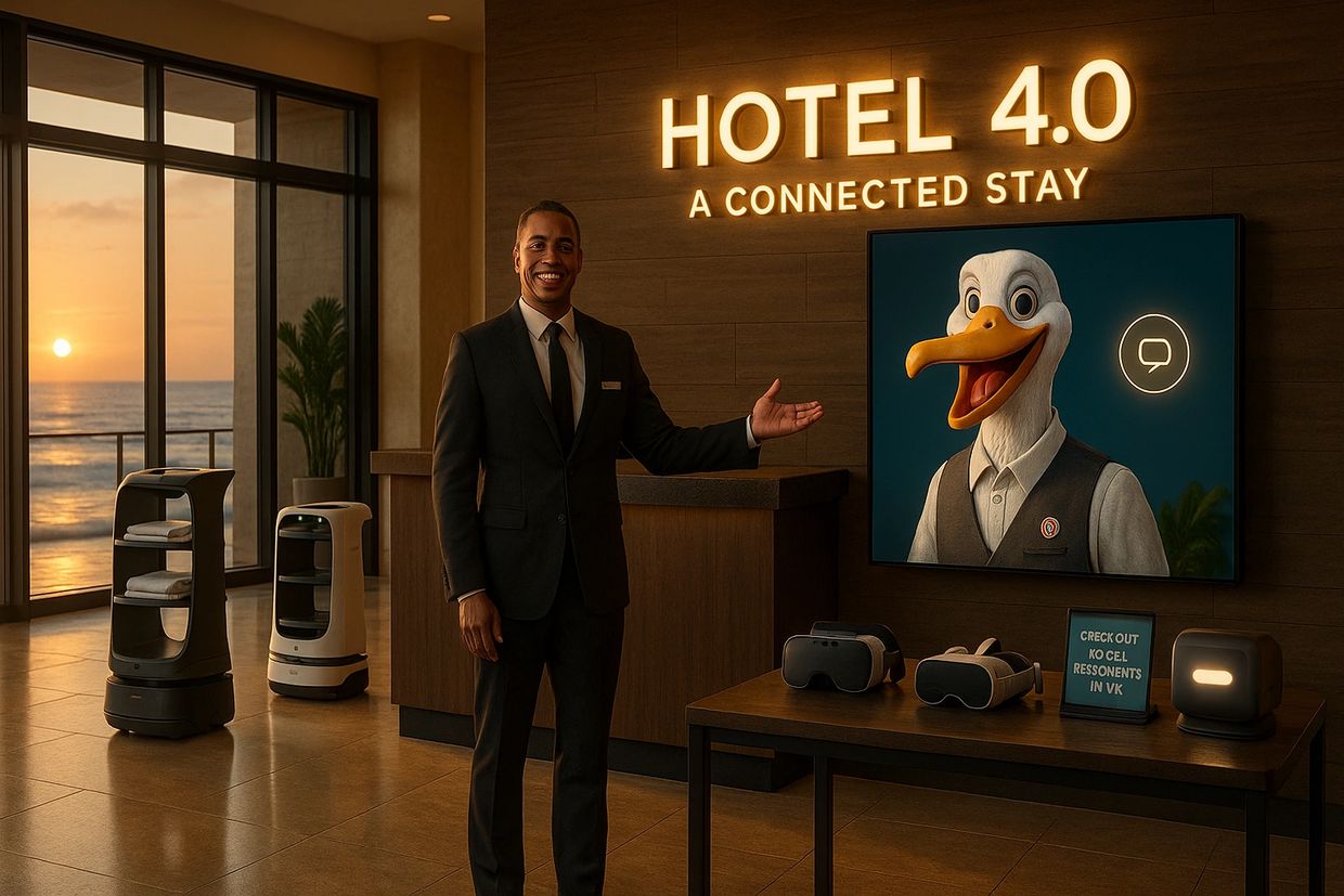 A Latino family steps through the hotel’s glass doors, sunlight spilling across the lobby floor. Laughter and the hum of travel fill the air as an interactive robot rolls forward, its digital eyes warm and expressive. “Welcome to Hotel 4.0 — The Future of Hotels,” the screen reads in both English and Spanish. The robot’s cheerful voice offers directions, answers in either language, and points out nearby attractions personalized to the family’s preferences.